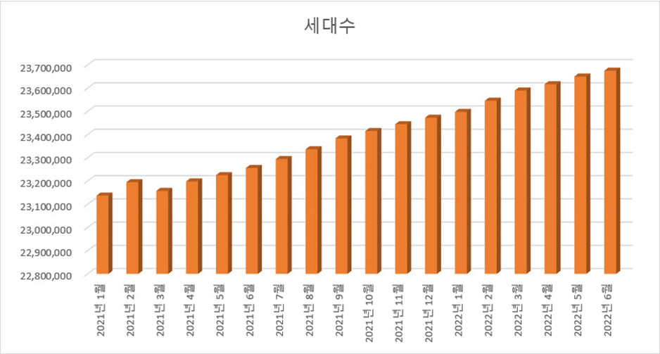 흥미로운 점은 인구는 점점 줄어들고 있는데 세대수가 증가하고 있다는 점입니다. 이것은 1인 가구가 급격하게 증가하고 있다는 의미입니다. 미국과 유럽은 오래전부터 그랬지만, 일본도 마찬가지로 학교를 졸업하면 일단 독립부터 하고 보는데 우리나라도 혼자 살거나 결혼해서 아이 없이 둘이서만 사는 경우가 급격하게 증가하고 있다는 사회적 현상을 확인할 수 있는 통계 자료입니다.