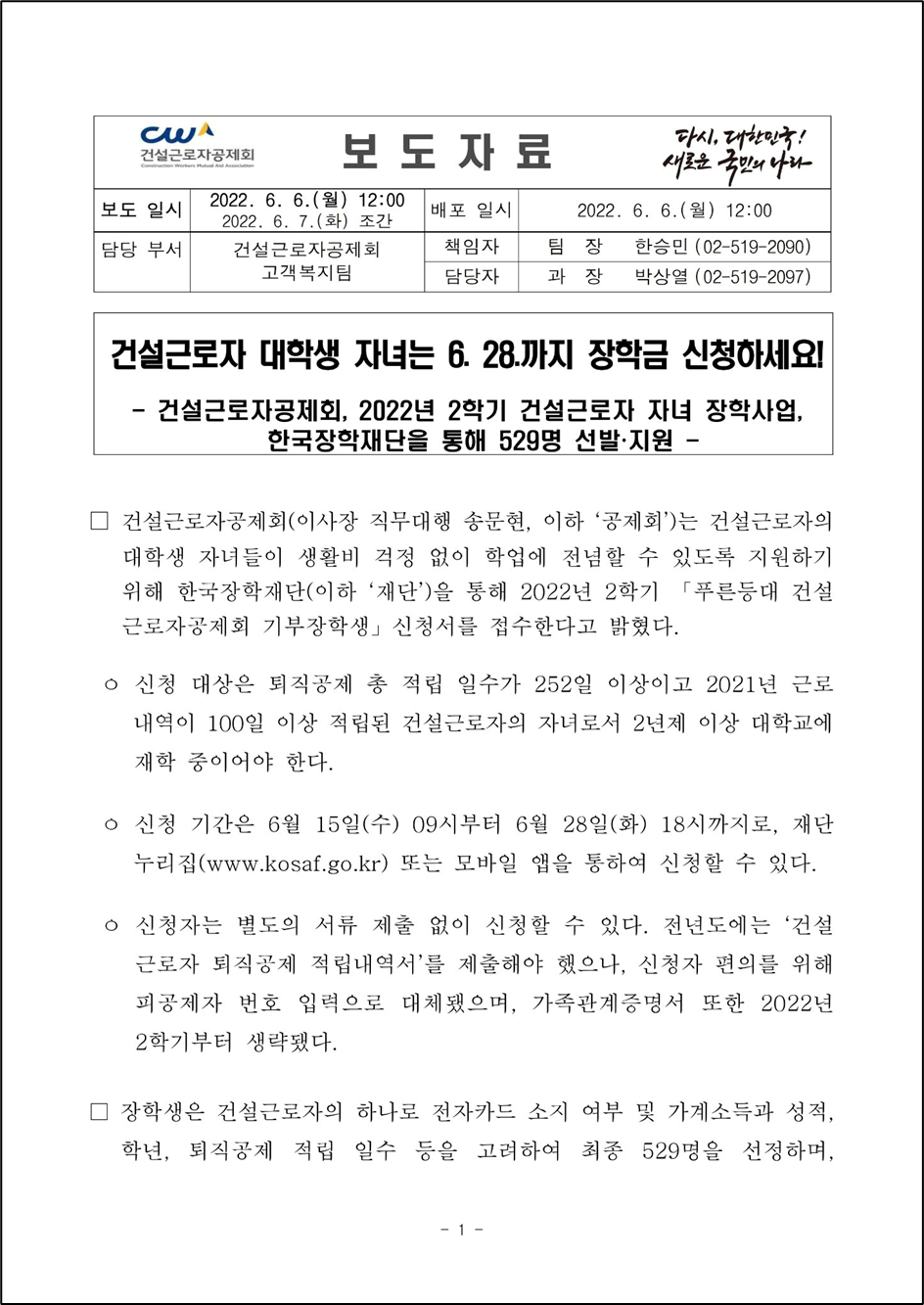 제목 건설근로자 대학생 자녀는 6. 28.까지 장학금 신청하세요! 등록일 2022-06-07 조회 971 - 건설근로자공제회, 2022년 2학기 건설근로자 자녀 장학사업, 한국장학재단을 통해 529명 선발?지원 -