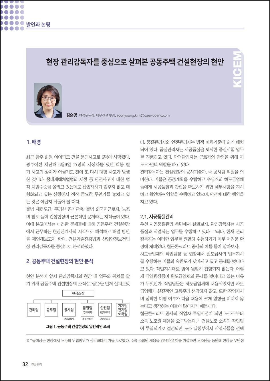 최근 광주 화정 아이파크 건물 붕괴사고로 6명이 사망했다. 광주에선 지난해 6월 9일 17명의 사상자를 냈던 학동 철거 사고의 상처가 아물기도 전에 또 다시 대형 사고가 발생한 것이다. 중대재해처벌법의 제정 등 안전사고에 대한 법적 처벌수준을 올리고 있는데도 산업재해가 멈추지 않고 대형화 되고 있는 상황에서 정작 중요한 무언가를 놓치고 있는 것은 아닌지 되돌아 볼 때다. 불법 재하도급, 무리한 공기단축, 불법 외국인근로자, 노조의 횡포 등이 건설현장의 근본적인 문제라는 지적들이 있다. 이에 본고에서는 이러한 문제들에 대해 공동주택 건설현장에서 근무하는 현장관계자의 시각으로 해석하고 해결 방안을 제언해보고자 한다. 건설기술진흥법과 산업안전보건법 상 관리감독자를 중심으로 분석하였다.