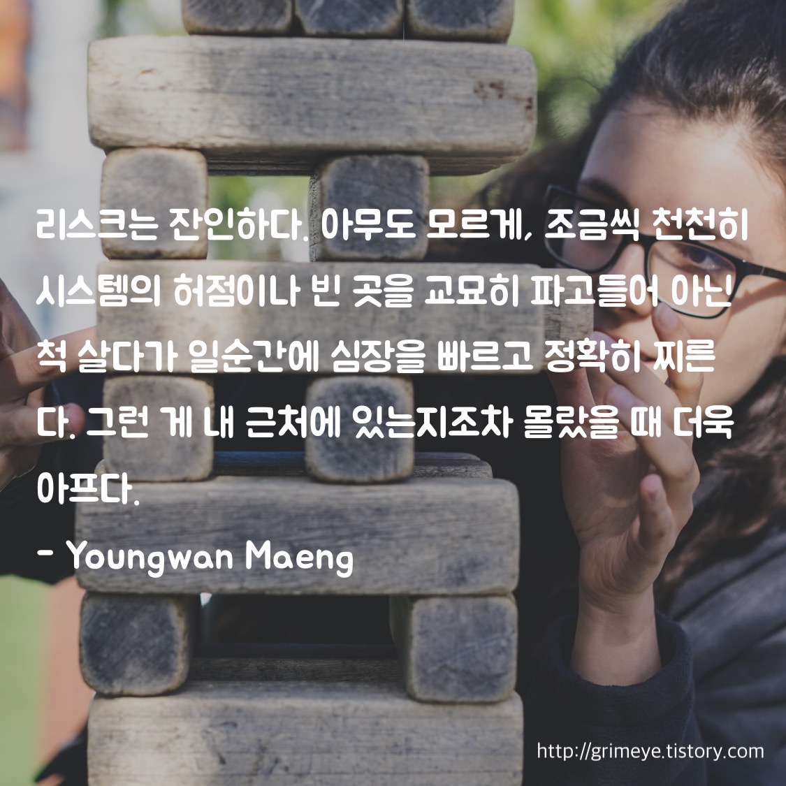 리스크는 잔인하다. 아무도 모르게, 조금씩 천천히 시스템의 허점이나 빈 곳을 교묘히 파고들어 아닌 척 살다가 일순간에 심장을 빠르고 정확히 찌른다. 그런 게 내 근처에 있는지조차 몰랐을 때 더욱 아프다.