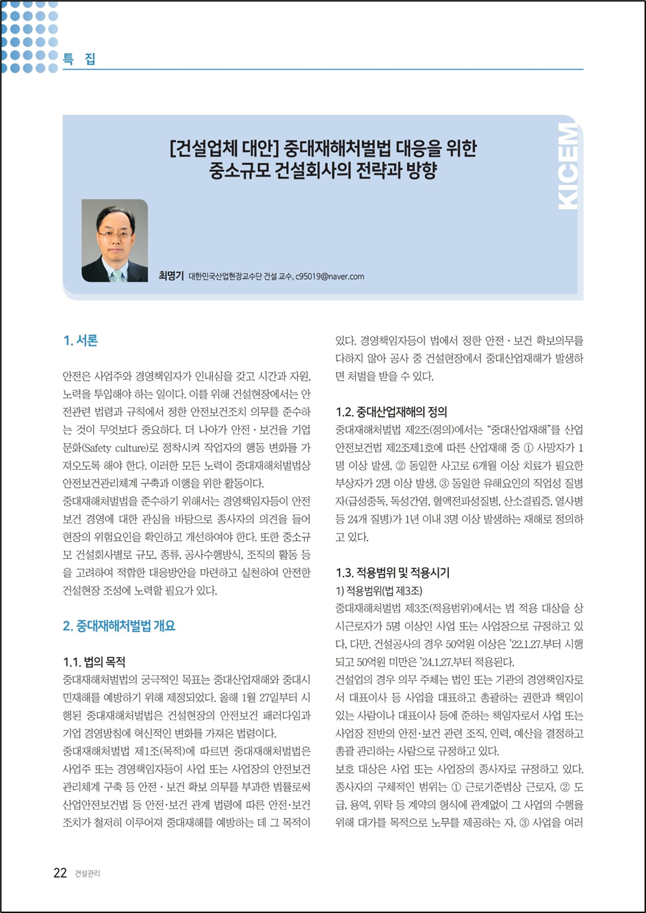 1.1. 법의 목적 중대재해처벌법의 궁극적인 목표는 중대산업재해와 중대시민재해를 예방하기 위해 제정되었다. 올해 1월 27일부터 시행된 중대재해처벌법은 건설현장의 안전보건 패러다임과 기업 경영방침에 혁신적인 변화를 가져온 법령이다. 중대재해처벌법 제1조(목적)에 따르면 중대재해처벌법은 사업주 또는 경영책임자 등이 사업 또는 사업장의 안전보건 관리체계 구축 등 안전ㆍ보건 확보 의무를 부과한 법률로써 산업안전보건법 등 안전·보건 관계 법령에 따른 안전·보건 조치가 철저히 이루어져 중대재해를 예방하는 데 그 목적이 있다. 경영책임자 등이 법에서 정한 안전ㆍ보건 확보 의무를 다하지 않아 공사 중 건설현장에서 중대산업재해가 발생하면 처벌을 받을 수 있다.