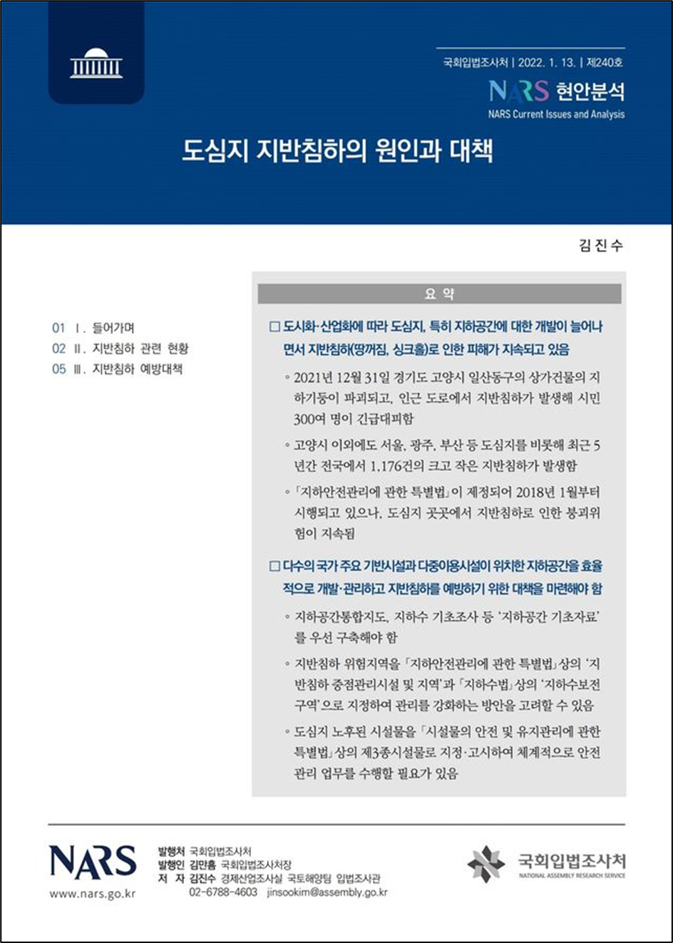 Ⅰ. 들어가며 Ⅱ. 지반침하 관련 현황 1. 지반침하의 개념 및 원인 2. 지반침하 관리 관련 주요 규정 3. 지반침하 발생 현황 Ⅲ. 지반침하 예방대책 1. 지하공간 기초자료 구축 가. 지하공간통합지