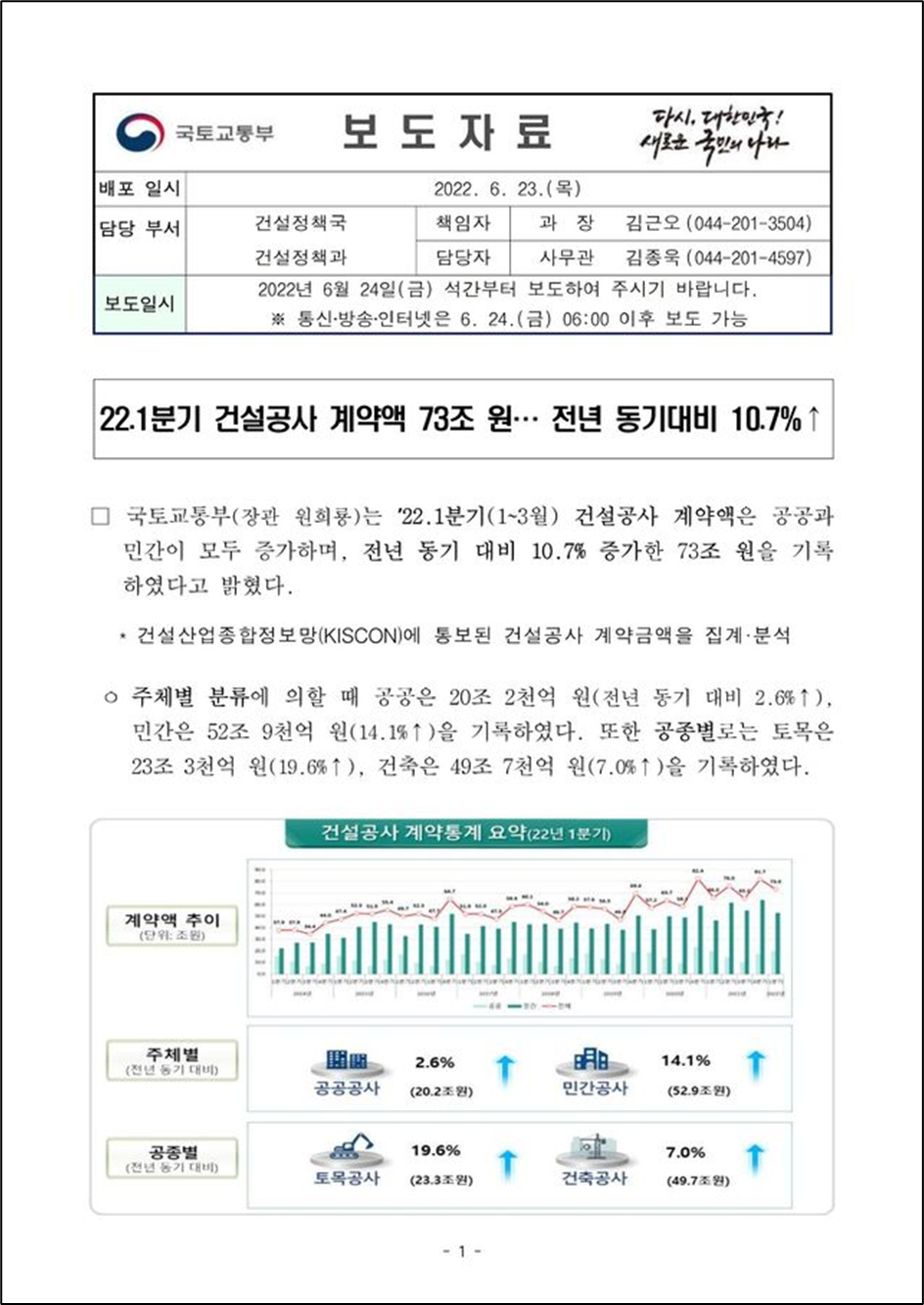 국토교통부(장관 원희룡)는 ’22.1분기(1~3월) 건설공사 계약액은 공공과 민간이 모두 증가하며, 전년 동기 대비 10.7% 증가한 73조 원을 기록하였다고 밝혔다.