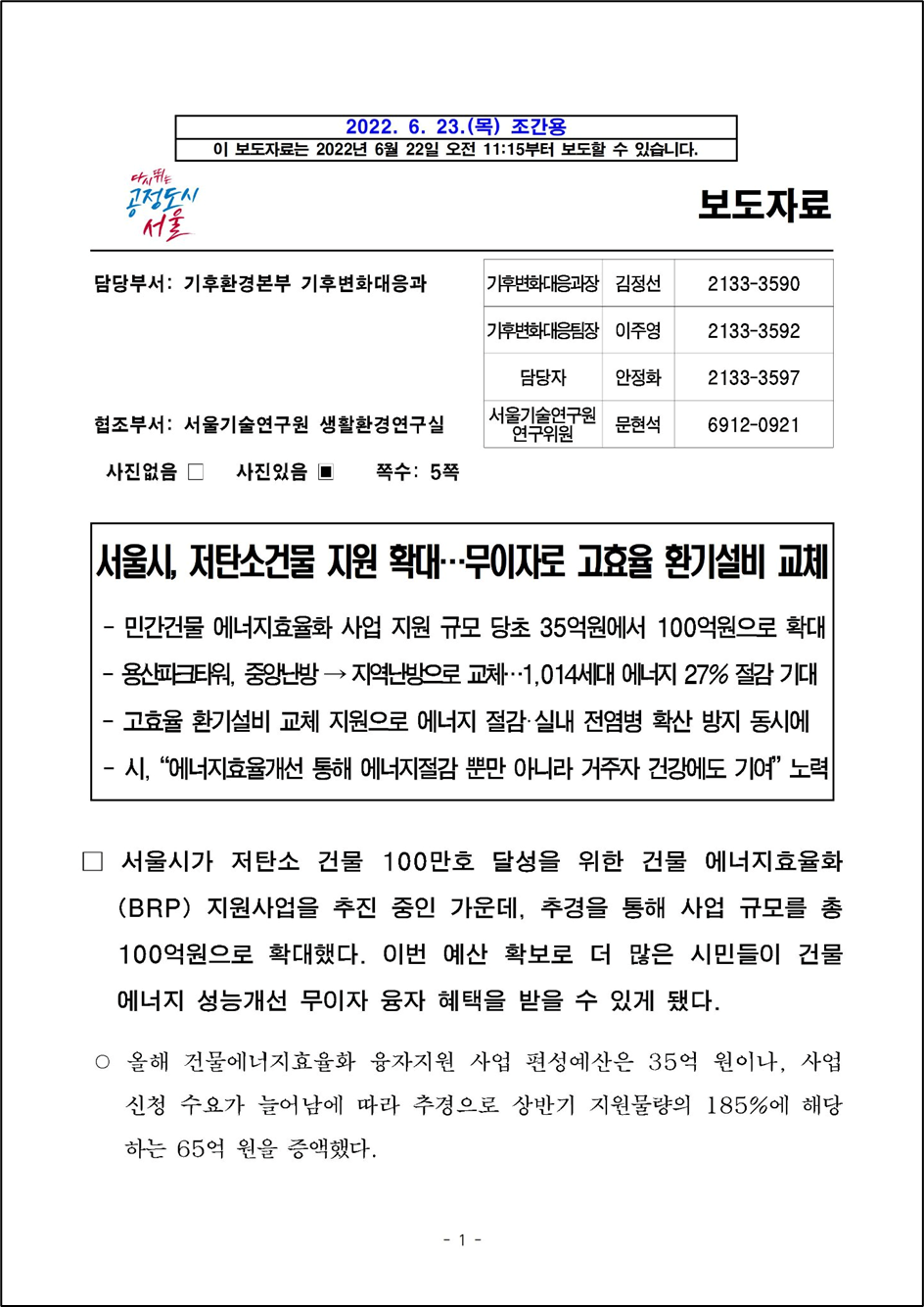 □ 서울시가 저탄소 건물 100만호 달성을 위한 건물 에너지효율화(BRP) 지원사업을 추진 중인 가운데, 추경을 통해 사업 규모를 총 100억원으로 확대했다. 이번 예산 확보로 더 많은 시민들이 건물 에너지 성능개선 무이자 융자 혜택을 받을 수 있게 됐다.