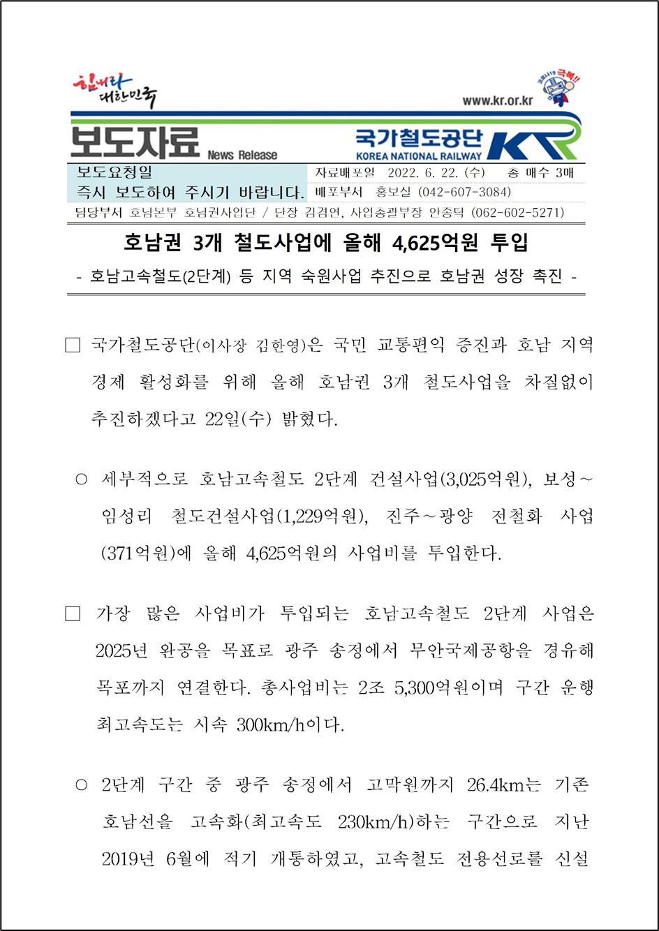 KR 홍보 - 보도ㆍ참고ㆍ해명자료(상세) - 보도 호남권 3개 철도사업에 올해 4,625억원 투입