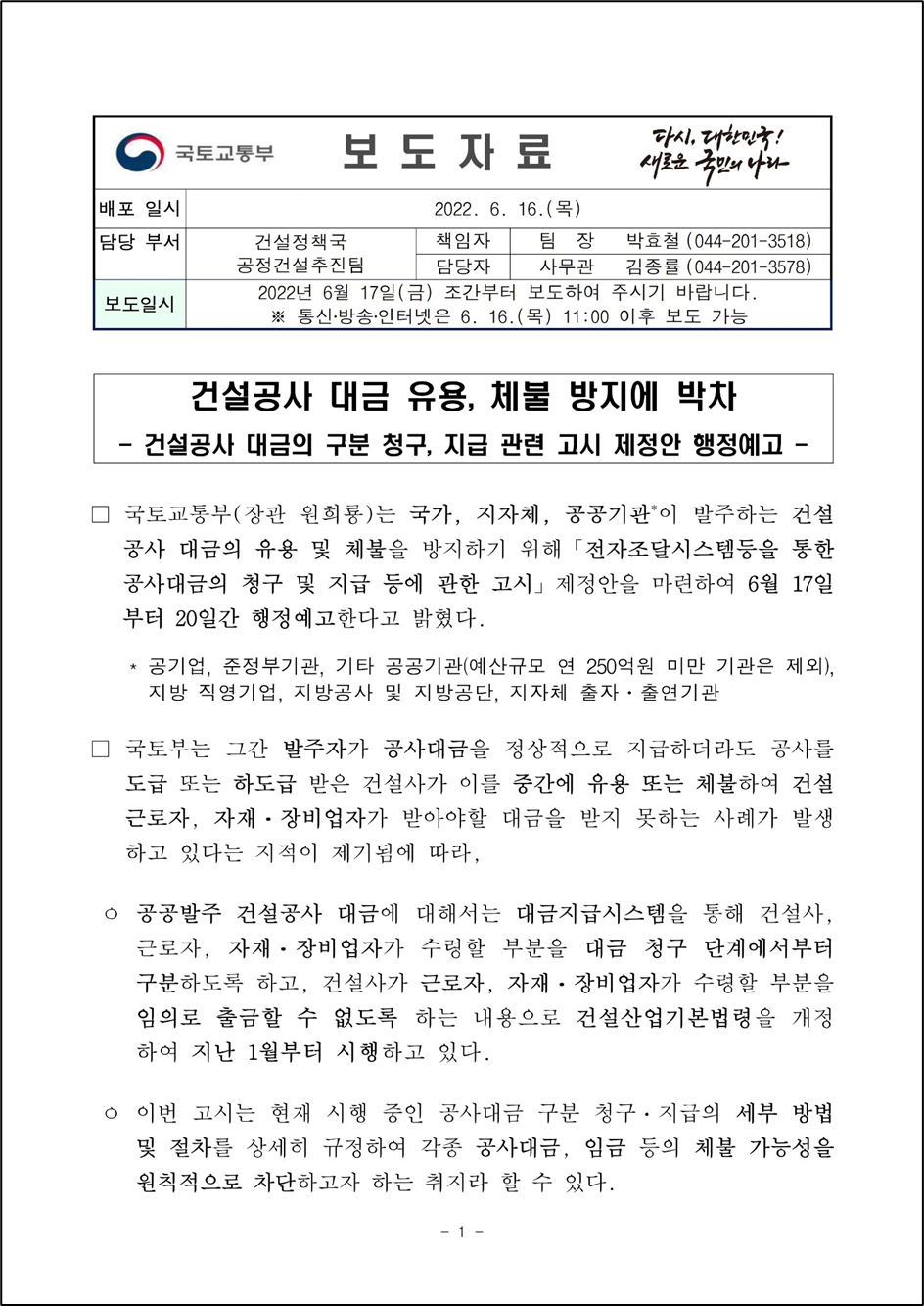 국토교통부(장관 원희룡)는 국가, 지자체, 공공기관*이 발주하는 건설공사 대금의 유용 및 체불을 방지하기 위해「전자조달시스템등을 통한 공사대금의 청구 및 지급 등에 관한 고시」제정안을 마련하여 6월 17일부터 20일간 행정예고한다고 밝혔다.