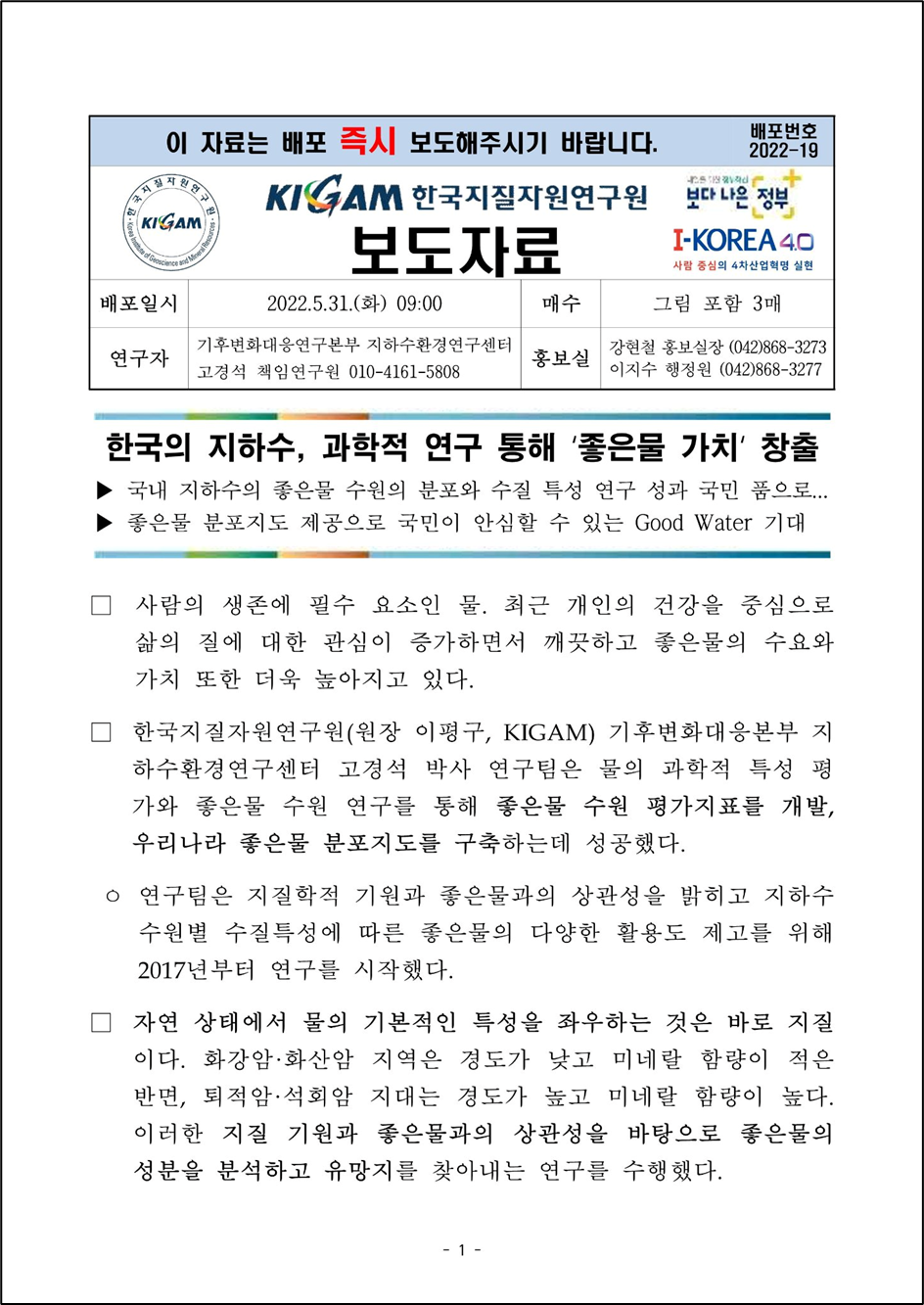 □ 이번 연구를 주도한 고경석 박사는 “좋은물 수원에 대한 과학적 연구를 통해 좋은물의 주요 미네랄, 극미량 성분 분석, 수원의 생성 원리와 잠재적 독성 등 건강 위해성을 평가해 일반 국민들이 다양하게 활용할 수 있는 방법들을 모색했다.”고 말하며, “한국의 지하수, 좋은물에 대한 지속적인 연구를 통해 건강하고 풍요로운 국민의 삶 증진을 위해 연구에 최선을 다하겠다.”고 밝혔다.