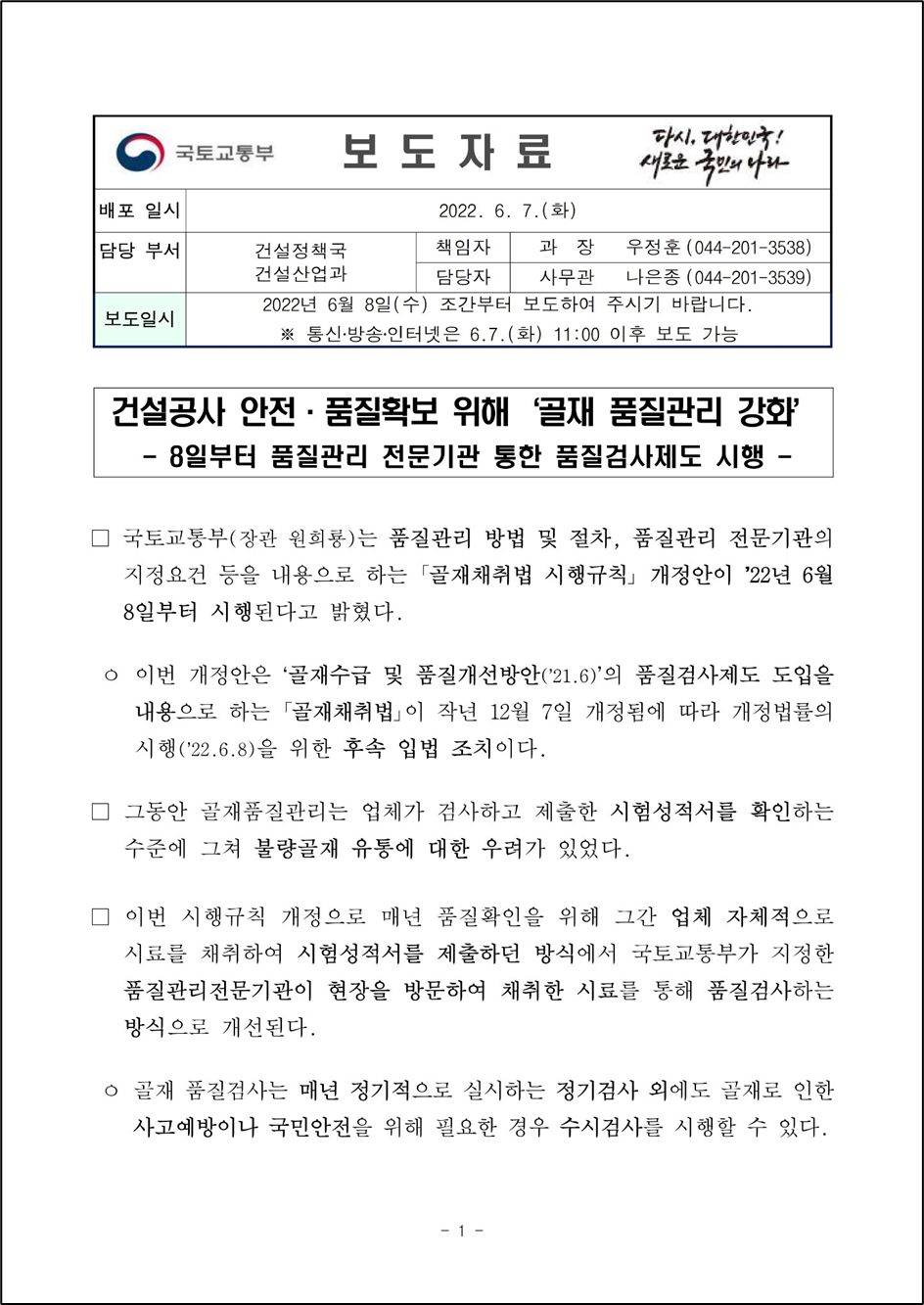 국토교통부(장관 원희룡)는 품질관리 방법 및 절차, 품질관리 전문기관의 지정요건 등을 내용으로 하는 「골재채취법 시행규칙」 개정안이 ’22년 6월 8일부터 시행된다고 밝혔다.