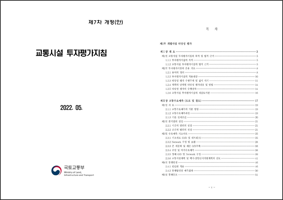 (1) 타당성 평가를 수행함에 있어 이를 규정하는 교통시설 투자평가지침 (이하 ‘투자평가지침’이라 한다)은 「국가통합교통체계효율화법」 및 동법 시행령을 근거로 작성되며, 이에 따라 모든 타당성 평가는 투자평가지침에 따라 수행되어야 한다.