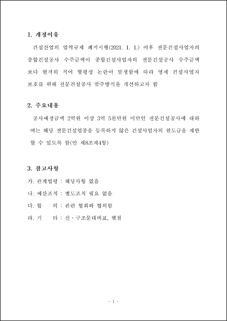 건설산업의 업역규제 폐지시행(2021. 1. 1.) 이후 전문건설사업자의 종합건설공사 수주금액이 종합건설사업자의 전문건설공사 수주금액 보다 현저히 적어 형평성 논란이 발생함에 따라 영세 건설사업자 보호를 위해 전문건설공사 발주방식을 개선하고자 함