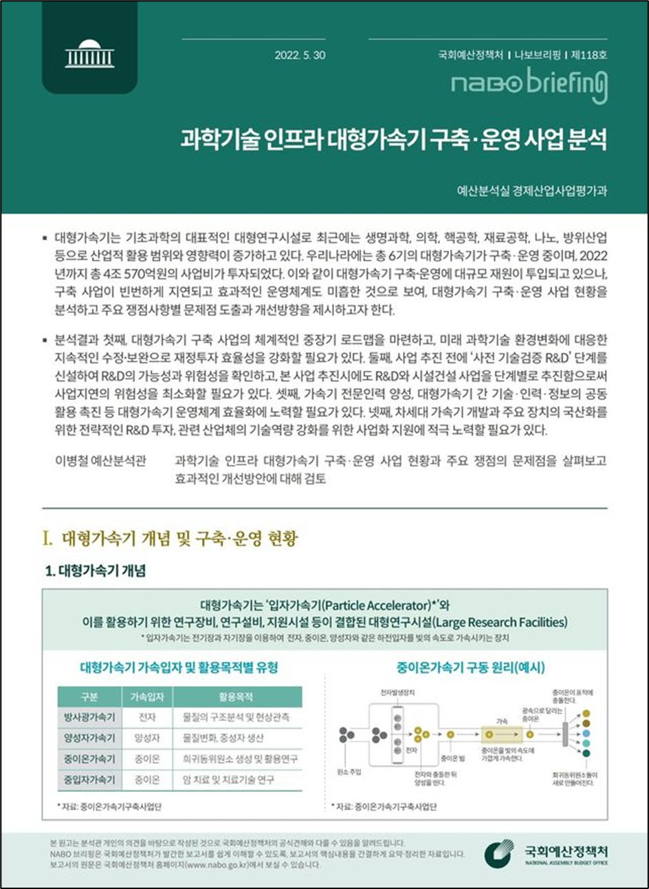 이와 같이 대형가속기 구축〮운영에 대규모 재원이 투입되고 있으나, 구축 사업이 빈번하게 지연되고 효과적인 운영체계도 미흡한 것으로 보여, 대형가속기 구축·운영 사업 현황을 분석하고 주요 쟁점사항별 문제점 도출과 개선방향을 제시하고자 한다.