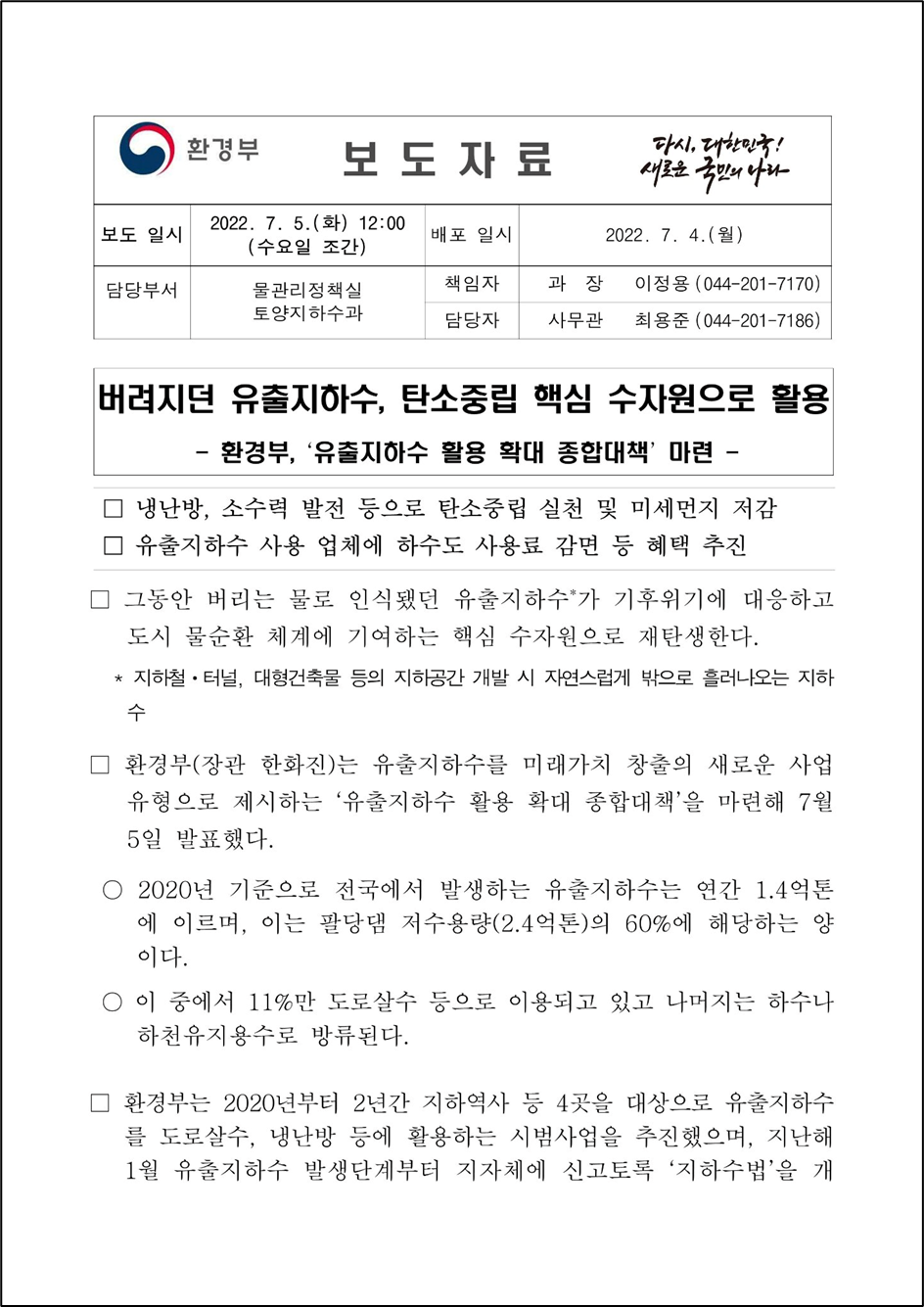 환경부(장관 한화진)는 유출지하수를 미래가치 창출의 새로운 사업 유형으로 제시하는 '유출지하수 활용 확대 종합대책'을 마련해 7월 5일 발표했다.