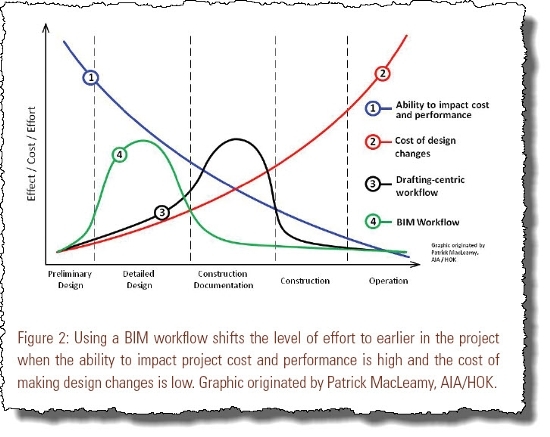 위 그림은 기존 방식으로 설계와 시공을 진행했을 경우 도면 작성과 연관 지어 나타낸 것입니다. 설계의 과정이라는 것이 결국 시간이 갈수록 구체화하고 상세화 해가는 과정이므로 3번 곡선이 설계 단계에서 증가하는 것이고, 시공이 시작되면 시공 도면 (Shop drawing)을 준비하고 각종 자재를 선택해서 장단점과 가격 경쟁력 등을 따지는 등 급격히 증가하지만 실제로 시공이 시작되면 도면 작업은 마무리가 되어 급감하게 되는 것입니다.