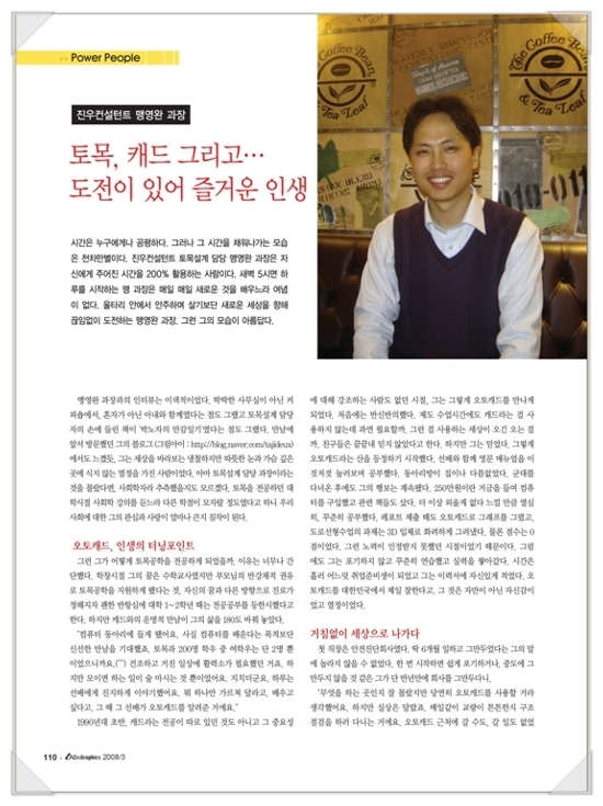 그는 그 길로 다시 취업전선에 뛰어 들었다. 그리고 현재 다니고 있는 진우컨설턴트에 면접을 보게 됐다. 오토캐드를 그렇게 잘하냐는 질문에 자신있게 그렇다고 답했다. 그런데 갑자기 영문으로 된 글을 읽으라고 주더란다.