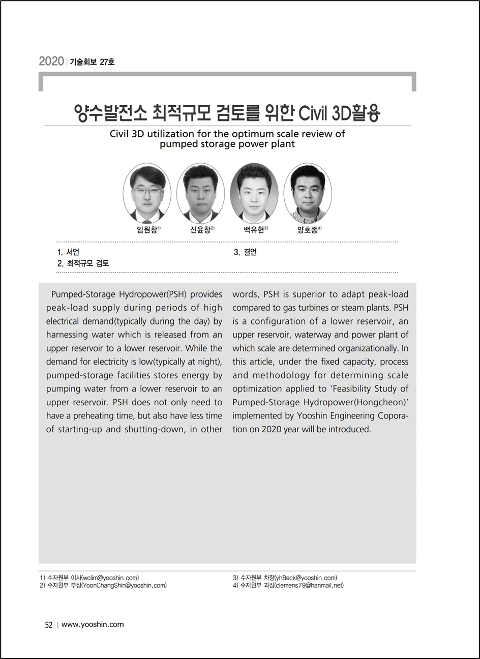 지난 2016년부터 조달청 발주 공사에 BIM 설계 적용이 의무화되고, 이에 따라 최근 LH와 도로공사를 중심으로 공공 발주가 BIM 설계로 전환되는 추세에 있으며, 국토교통부의 BIM 확대 정책으로 장래에는 BIM 설계가 일반화될 것으로 예상된다. 본 고에서는 2020년 현재 ㈜유신에서 수행하고 있는 ‘양수건설 타당성조사(홍천지점)’ 용역을 중심으로 발전소의 시설용량이 결정되어 있는 조건에서 BIM 설계Tool인 Autodesk사의 Civil3D를 활용하여 주요 시설의 최적규모를 결정하는 절차 및 방법을 소개한다.