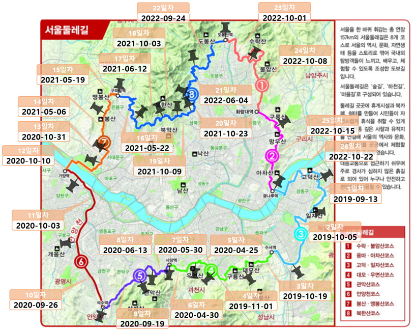 2019년 9월 1일, 모든 게 그때 시작되었습니다. 딸 아이와 한양도성길을 완주하고 얼마 지나지 않은 때였는데, 와이프가 집 근처인 아차산에 놀러가자고 해서 놀러갔던 그 날 모든 것이 시작되었습니다. 별 생각없이 즐겁게 걷고 있던 중 빨간 우체통처럼 생긴 스탬프 투어 시설을 보고 잠시 멈춰 구경하며 발견한 지도와 스탬프 종이를 보고 곧바로 다음 목표를 정했습니다. 서울둘레길을 완주해보자!