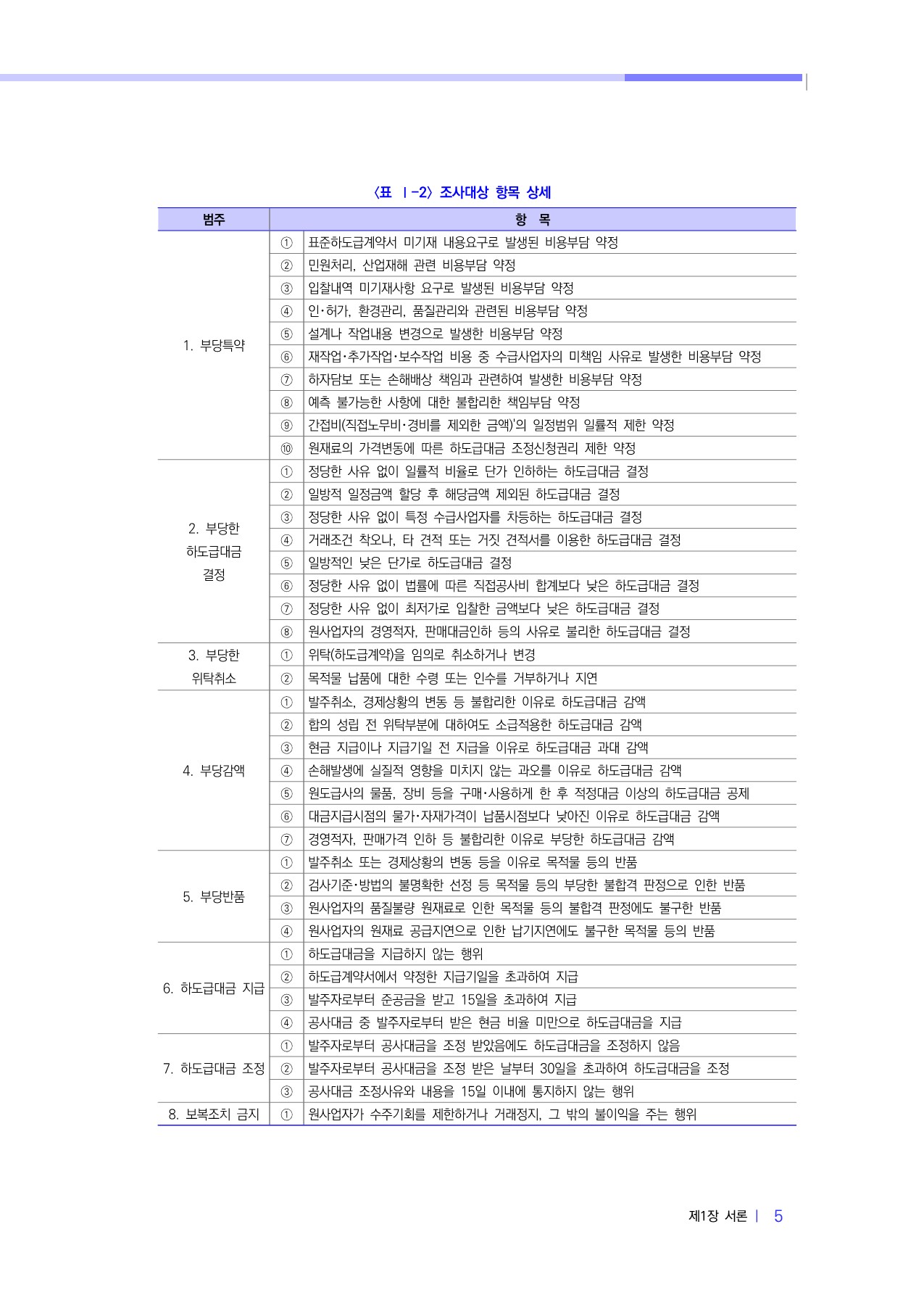 ○ 건설하도급에서 중요한 거래유형과 불공정거래 정도가 심각하다고 판단한 행위를 업계 관계자, 전문건설협회 담당자 및 전문가 간의 협의를 통해 선별하여 조사대상으로 정하였음. - 불공정행위에 대하여 3배 이내 손해배상 청구가 가능한 부당한 하도급대금 결정, 부당한 위탁취소, 부당반품 및 부당감액. - 하도급업체의 권익을 제약하는 불공정한 특수조건을 설정하는 행위. - 원도급업체가 법령 또는 하도급계약으로 정한 하도급대금을 지급하지 않는 행위, 원도급업체가 발주자로부터 계약금액을 조정 받았음에도 하도급대금을 조정하지 않는 행위. - 하도급업체에 대한 보복조치.