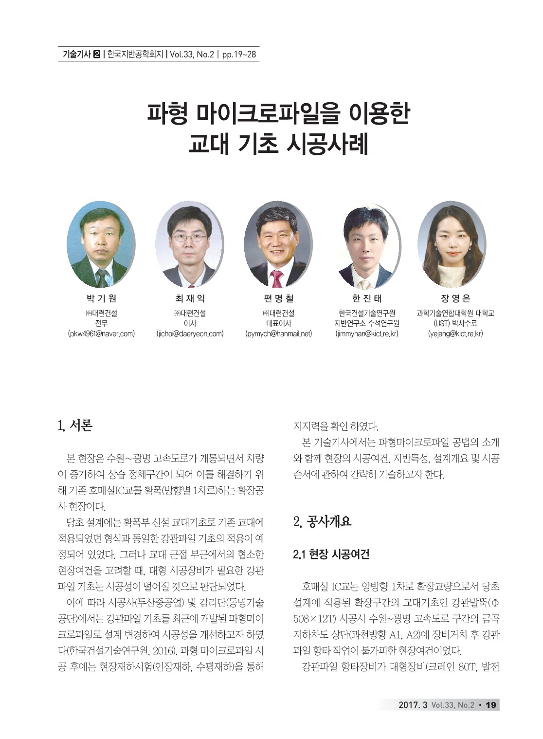 본 현장은 수원∼광명 고속도로가 개통되면서 차량이 증가하여 상습 정체구간이 되어 이를 해결하기 위해 기존 호매실IC교를 확폭(방향별 1차로)하는 확장공사 현장이다. 당초 설계에는 확폭부 신설 교대기초로 기존 교대에 적용되었던 형식과 동일한 강관파일 기초의 적용이 예정되어 있었다. 그러나 교대 근접 부근에서의 협소한 현장여건을 고려할 때, 대형 시공장비가 필요한 강관 파일 기초는 시공성이 떨어질 것으로 판단되었다. 이에 따라 시공사(두산중공업) 및 감리단(동명기술공단)에서는 강관파일 기초를 최근에 개발된 파형마이크로파일로 설계 변경하여 시공성을 개선하고자 하였다(한국건설기술연구원, 2016). 파형 마이크로파일 시공 후에는 현장재하시험(인장재하, 수평재하)을 통해 지지력을 확인 하였다. 본 기술기사에서는 파형마이크로파일 공법의 소개와 함께 현장의 시공여건, 지반특성, 설계개요 및 시공 순서에 관하여 간략히 기술하고자 한다.