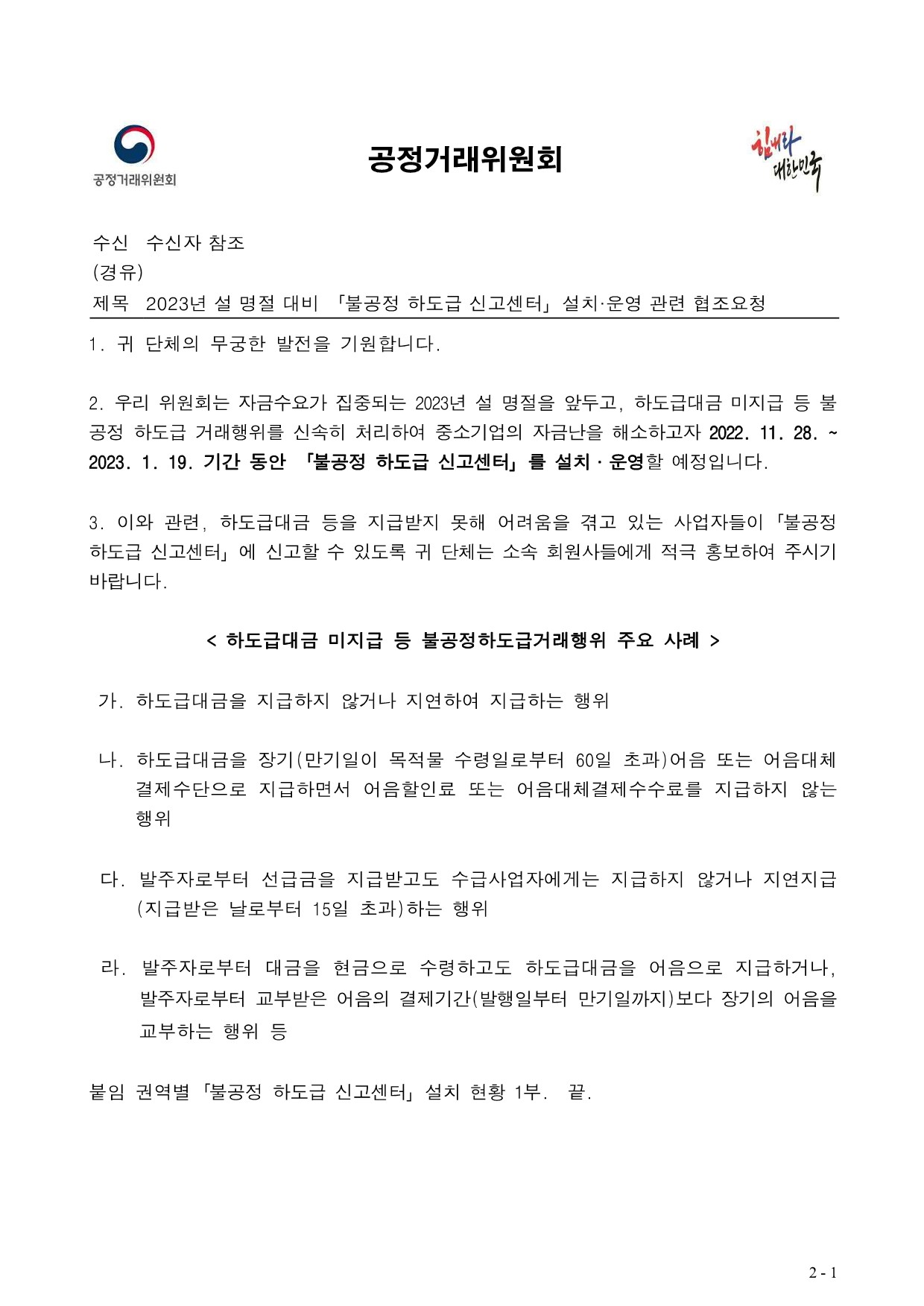 □ 공정거래위원회(이하 공정위)는 2023년 설을 앞두고 중소 하도급 업체들이 대금을 제때 지급받을 수 있도록 2022년 11월 28일부터 2023년 1월 19일까지(53일간) ‘불공정 하도급 신고센터’를 운영한다.