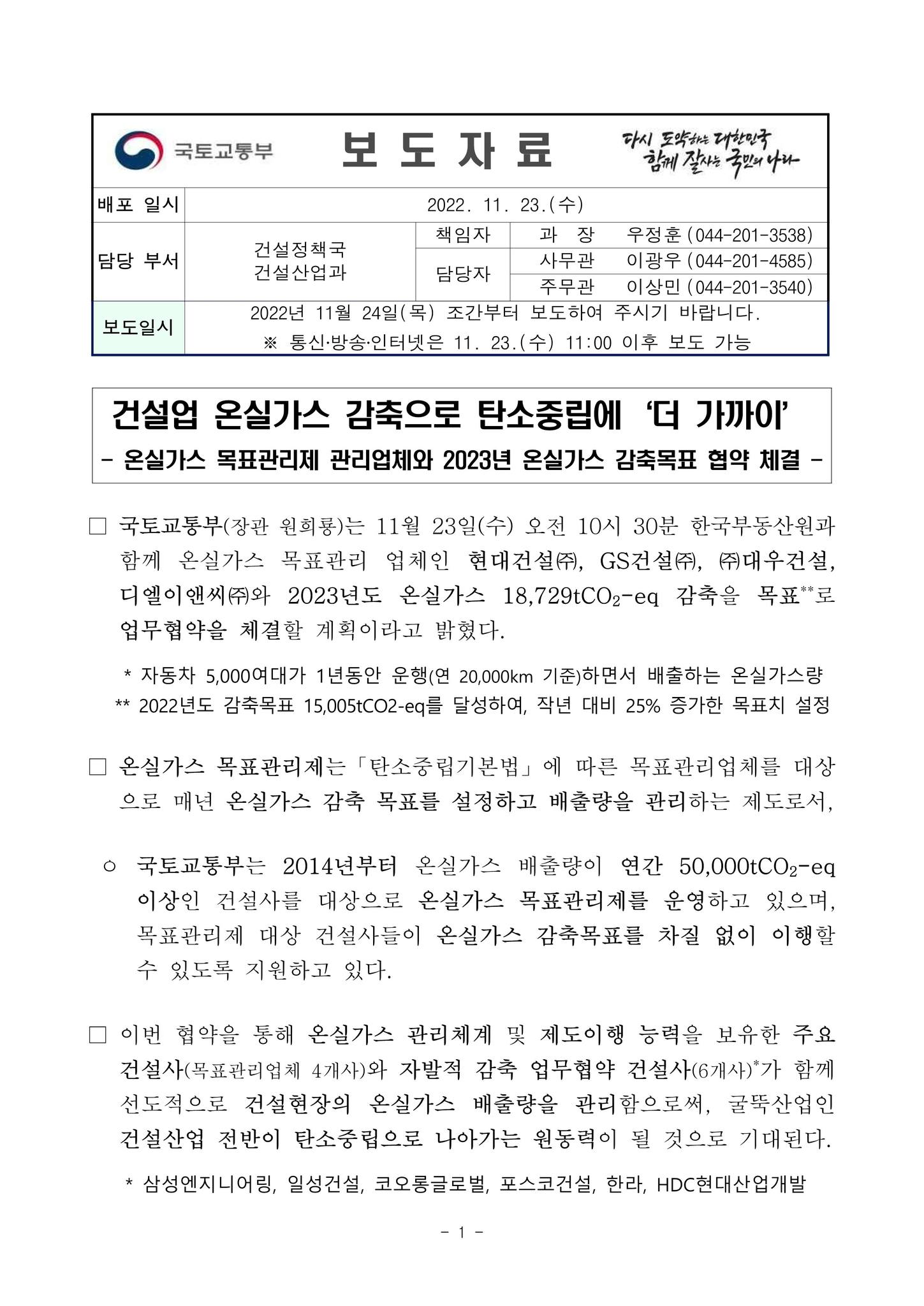 국토교통부(장관 원희룡)는 11월 23일(수) 오전 10시 30분 한국부동산원과 함께 온실가스 목표관리 업체인 현대건설㈜, GS건설㈜, ㈜대우건설, 디엘이앤씨㈜와 2023년도 온실가스 18,729tCO2-eq 감축을 목표**로 업무협약을 체결할 계획이라고 밝혔다.