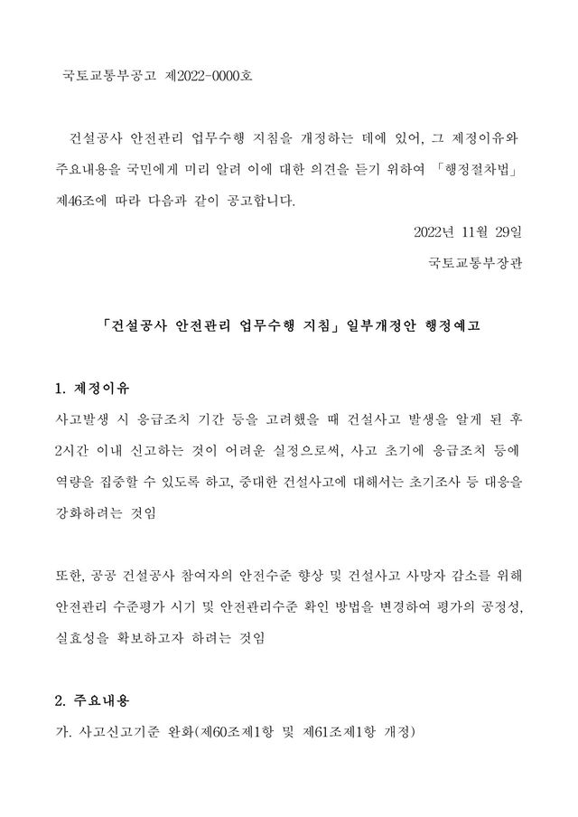 「건설공사 안전관리 업무수행 지침」 일부 개정(안)