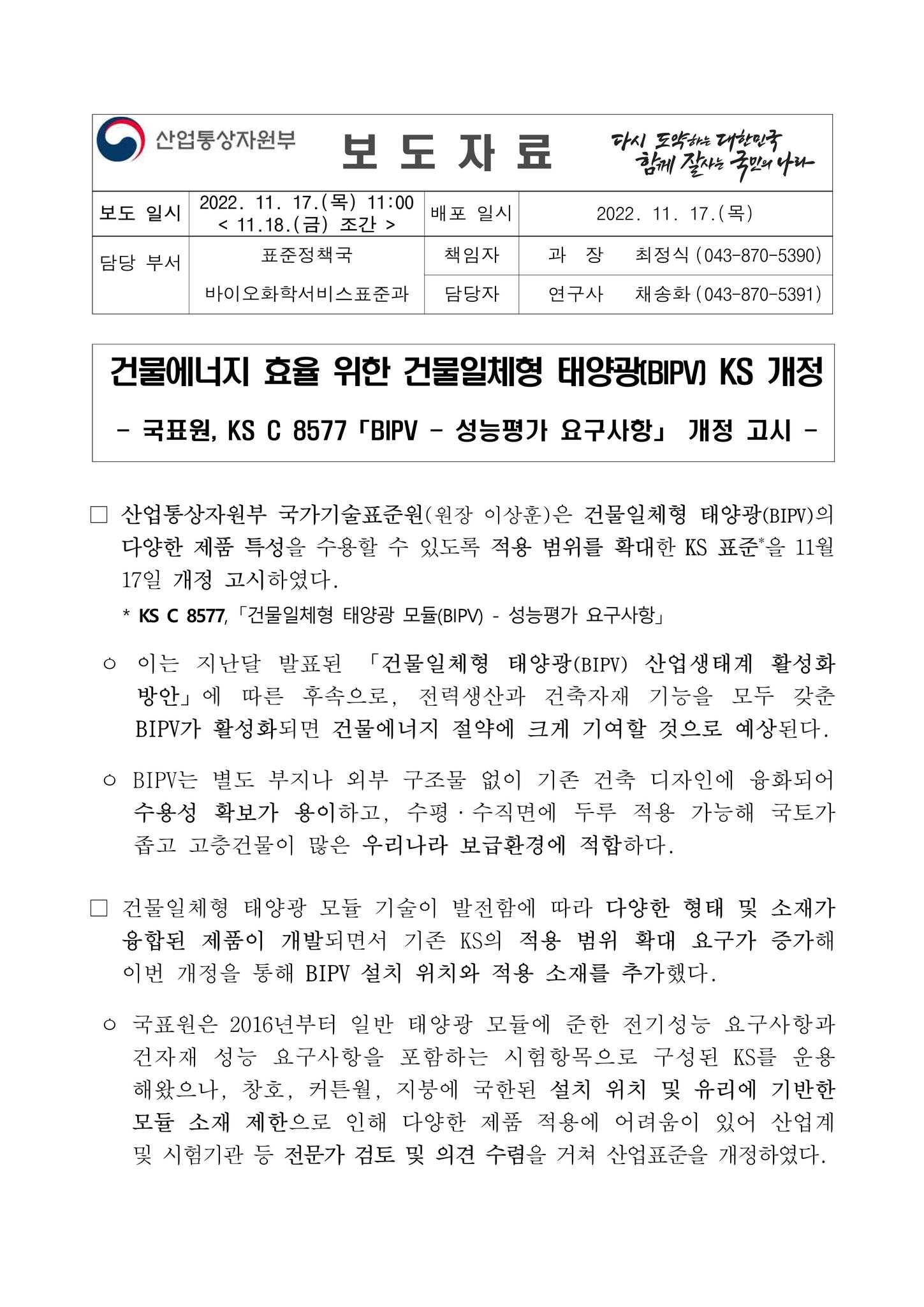 국표원, KS C 8577 「BIPV - 성능평가 요구사항」 개정 고시