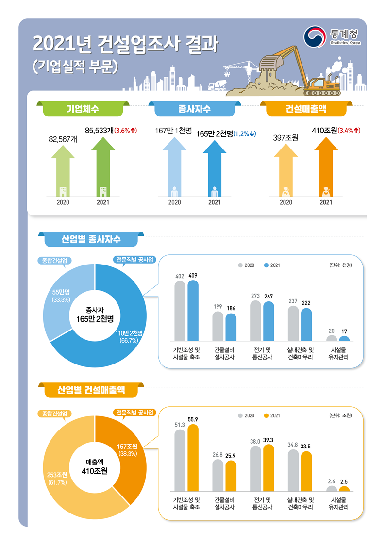 2021년 건설업 기업체수 전년대비 3.6% 증가, 종사자수 1.2% 감소, 매출액 3.4% 증가, 건설비용 3.4% 증가, 부가가치 2.5% 증가