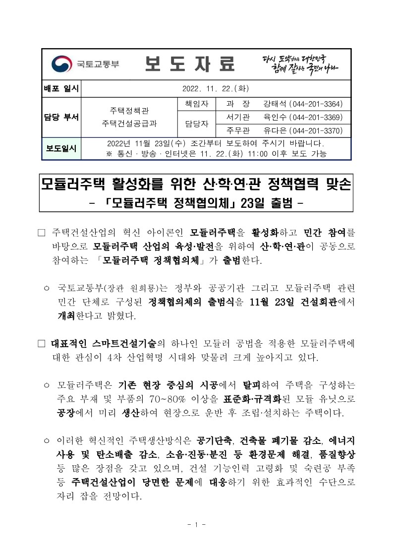 국토교통부(장관 원희룡)는 정부와 공공기관 그리고 모듈러주택 관련 민간 단체로 구성된 정책협의체의 출범식을 11월 23일 건설회관에서 개최한다고 밝혔다.