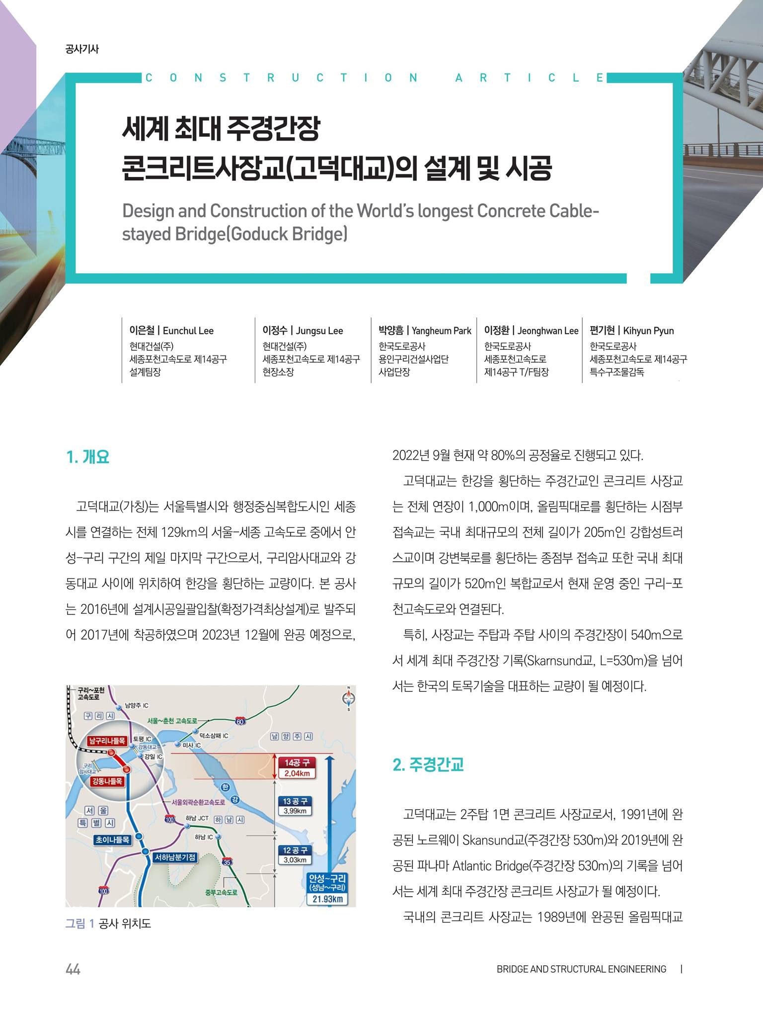 고덕대교는 2주탑 1면 콘크리트사장교로서, 1991년에 완공된 노르웨이 Skansund교(주경간장 530m)와 2019년에 완공된 파나마 Atlantic Bridge(주경간장 530m)의 기록을 넘어서는 세계 최대 주경간장 콘크리트 사장교가 될 예정이다. 국내의 콘크리트 사장교는 1989년에 완공된 올림픽대교를 시초로, 신행주대교와 팔당대교가 1991년과 1992년에 각각 시공 중에 불미스런 사고를 겪었으며 현대건설(주)이 2012년에 대동화명대교(주경간장 270m)가 사고 없이 완공됨으로써 본격적인 콘크리트 사장교가 활발하게 적용되기 시작했다. 2020년에는 주경간장 500m의 조발화양대교 또한 현대건설 (주)에 의해 성공리에 완공되어 조발화양대교의 설계 및 시공 경험을 토대로 고덕대교 설계의 기틀을 다지게 되었다.