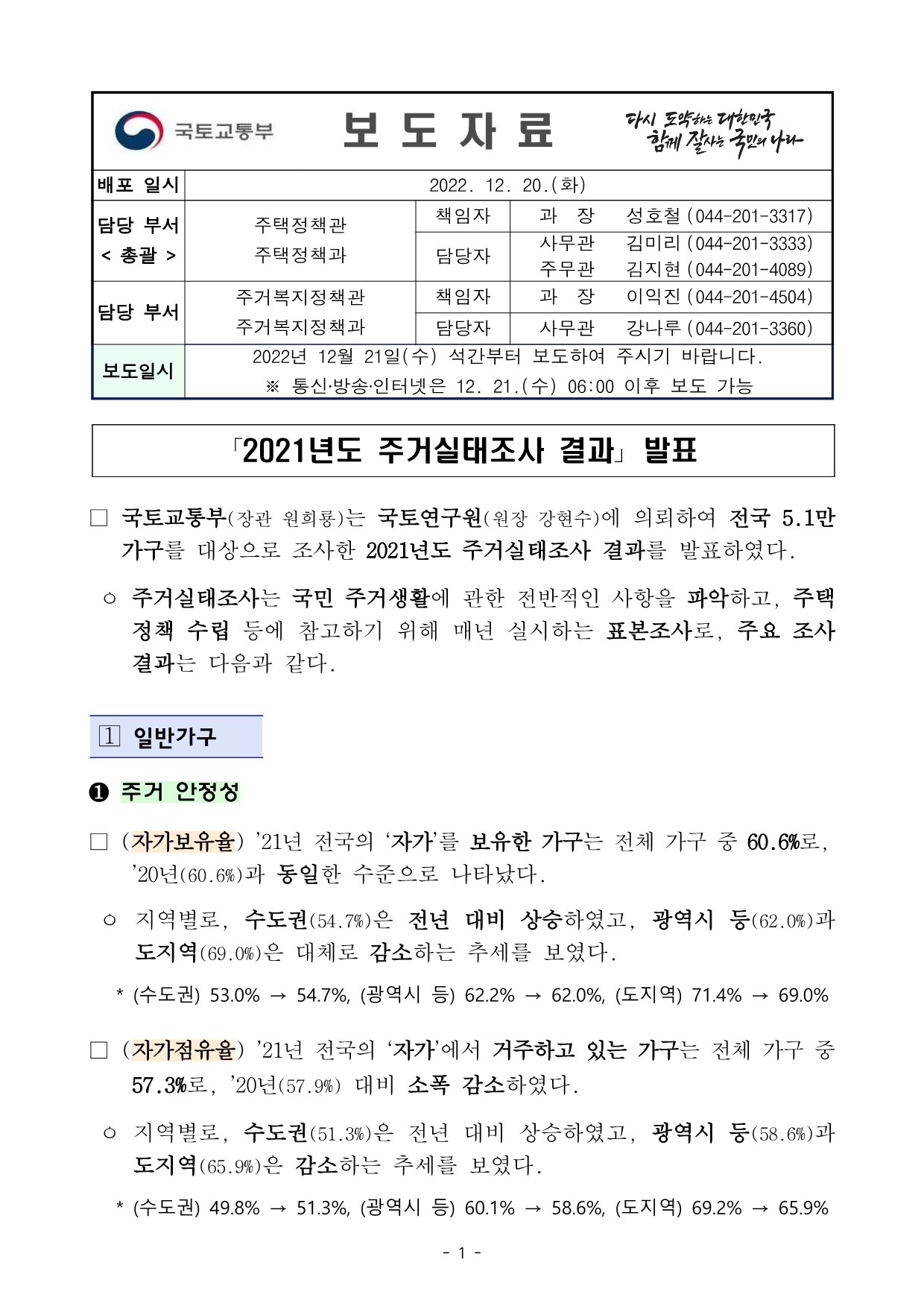 국토교통부(장관 원희룡)는 국토연구원(원장 강현수)에 의뢰하여 전국 5.1만 가구를 대상으로 조사한 2021년도 주거실태조사 결과를 발표하였다.