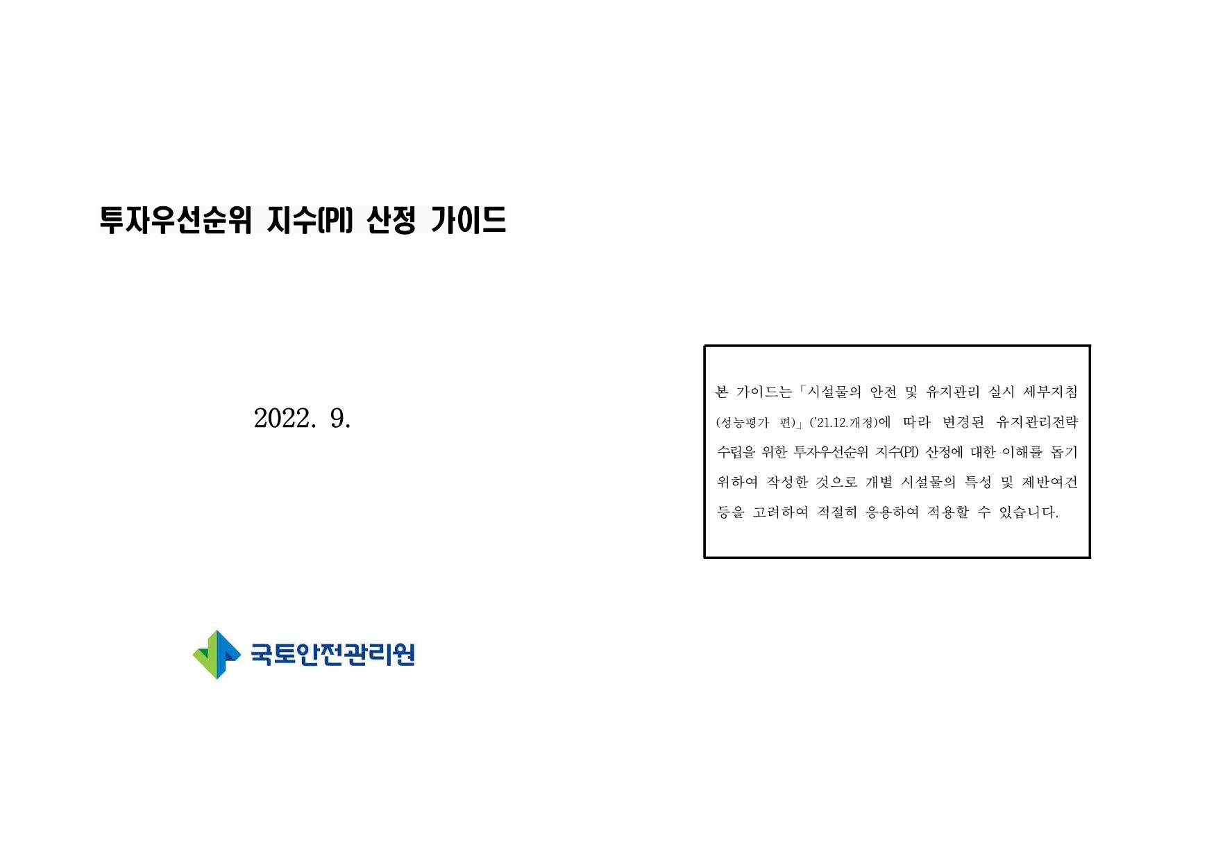 이에 투자우선순위지수 산출 가이드북은 투자우선순위 지수(PI) 산정시 시설물별 각 가중치의 적용방법에 대한 상세 설명 및 예시를 제시함으로서 실무자의 이해를 돕고 합리적이고 표준화된 투자우선순위 산정을 유도하기 위해 작성하였다.