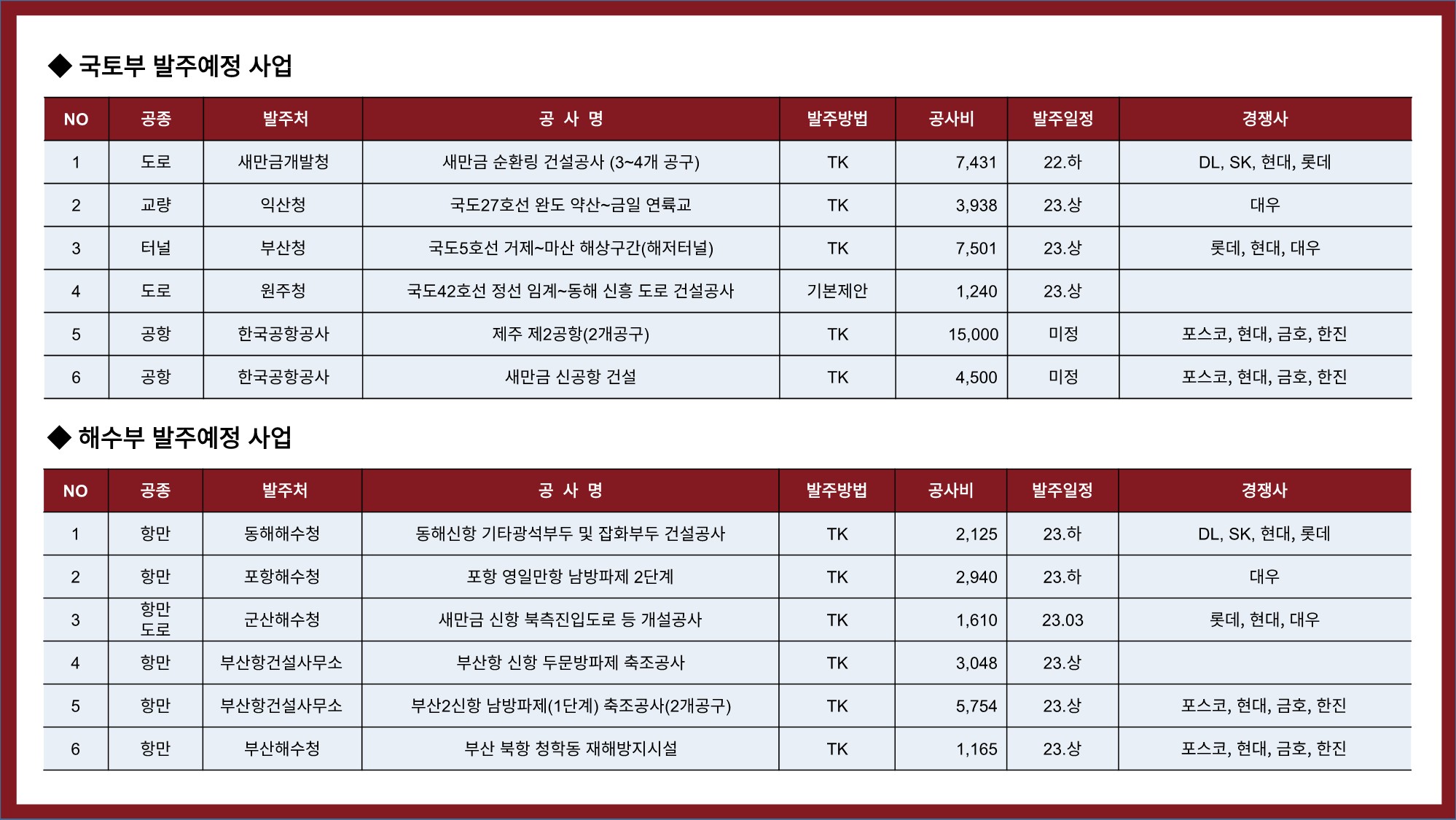 | 1 | 도로 | 새만금개발청 | 새만금 순환링 건설공사 (3~4개 공구) | TK | 7,431 | 22.하 | DL, SK, 현대 롯데 |