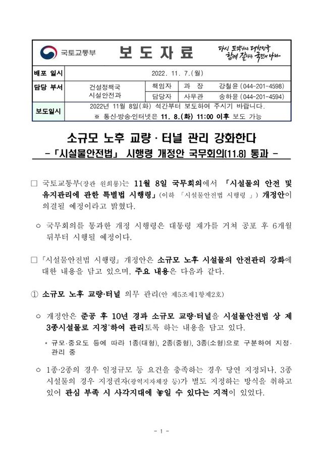 국토교통부(장관 원희룡)는 11월 8일 국무회의에서 「시설물의 안전 및 유지관리에 관한 특별법 시행령」(이하 「시설물안전법 시행령 」) 개정안이 의결될 예정이라고 밝혔다.