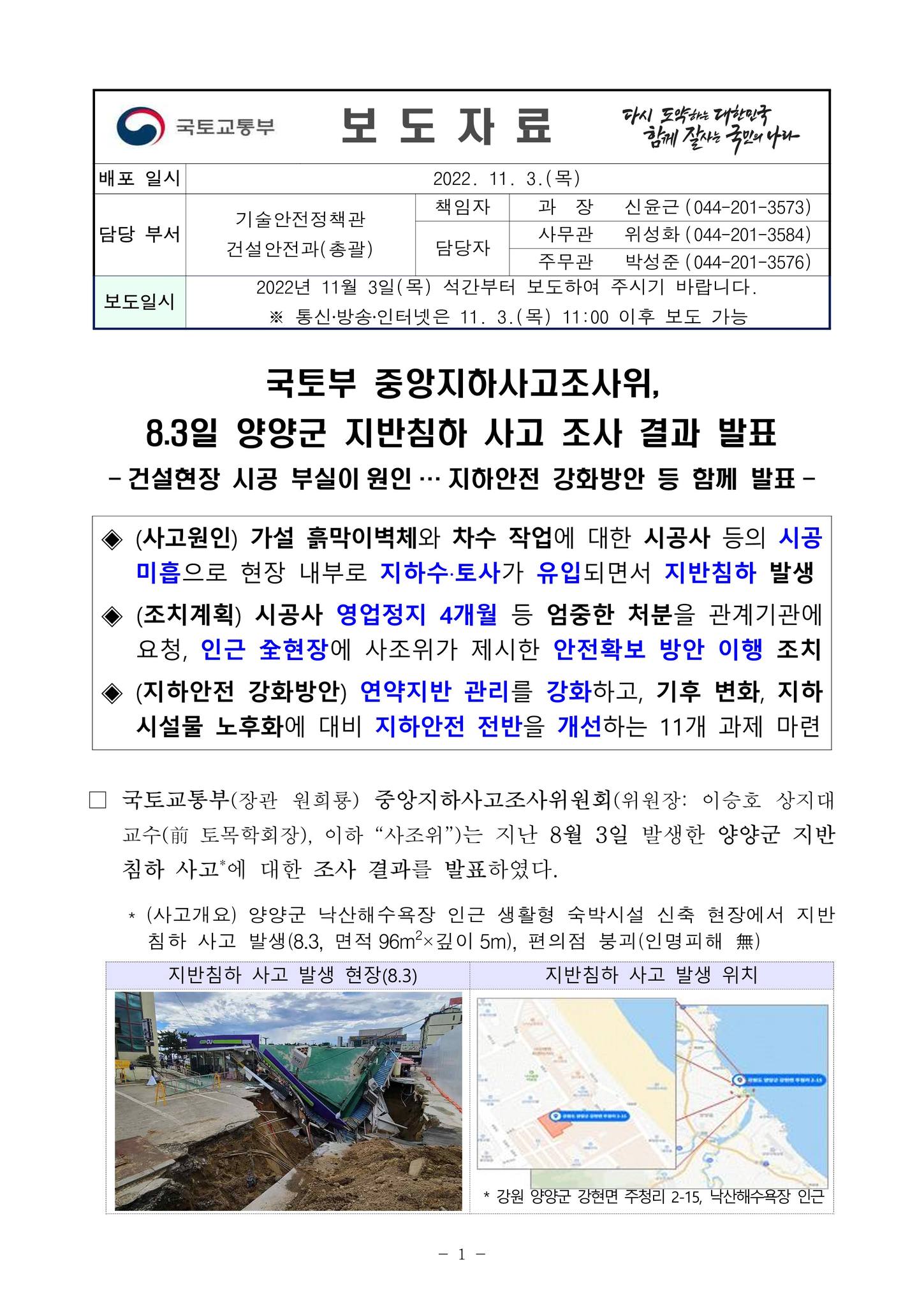 국토교통부(장관 원희룡) 중앙지하사고조사위원회(위원장: 이승호 상지대 교수(前 토목학회장), 이하 “사조위”)는 지난 8월 3일 발생한 양양군 지반침하 사고*에 대한 조사 결과를 발표하였다.