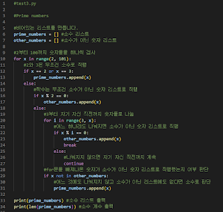 일하다가 갑자기 떠올랐습니다. “주어진 범위 안에 있는 소수를 모두 찾아내는 프로그램을 만들면 재미있겠다.” 그래서 만들어봤습니다. 코딩의 내용은 다음과 같습니다.