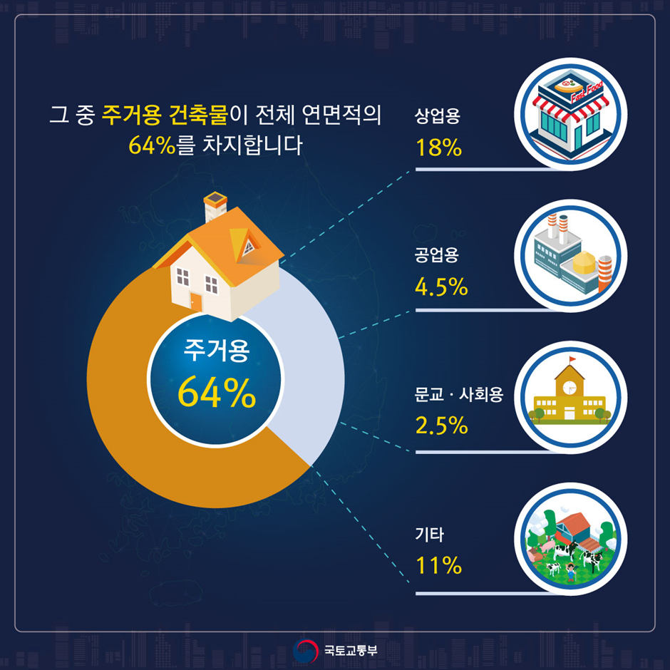 우리나라 건축물 중 64%가 주거용 건축물이고, 상업용 18%, 공업용 4.5%, 교육 및 사회용 2.5%, 기타 11%로 구성되어 있다고 합니다.