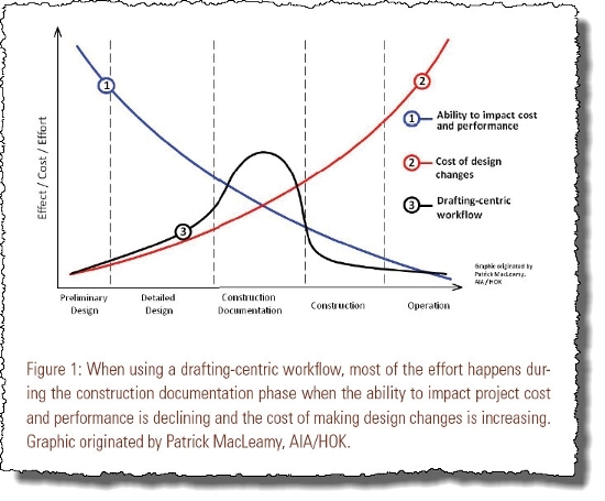 위 그림은 기존 방식으로 설계와 시공을 진행했을 경우 도면 작성과 연관 지어 나타낸 것입니다. 설계의 과정이라는 것이 결국 시간이 갈수록 구체화하고 상세화 해가는 과정이므로 3번 곡선이 설계 단계에서 증가하는 것이고, 시공이 시작되면 시공 도면 (Shop drawing)을 준비하고 각종 자재를 선택해서 장단점과 가격 경쟁력 등을 따지는 등 급격히 증가하지만 실제로 시공이 시작되면 도면 작업은 마무리가 되어 급감하게 되는 것입니다.