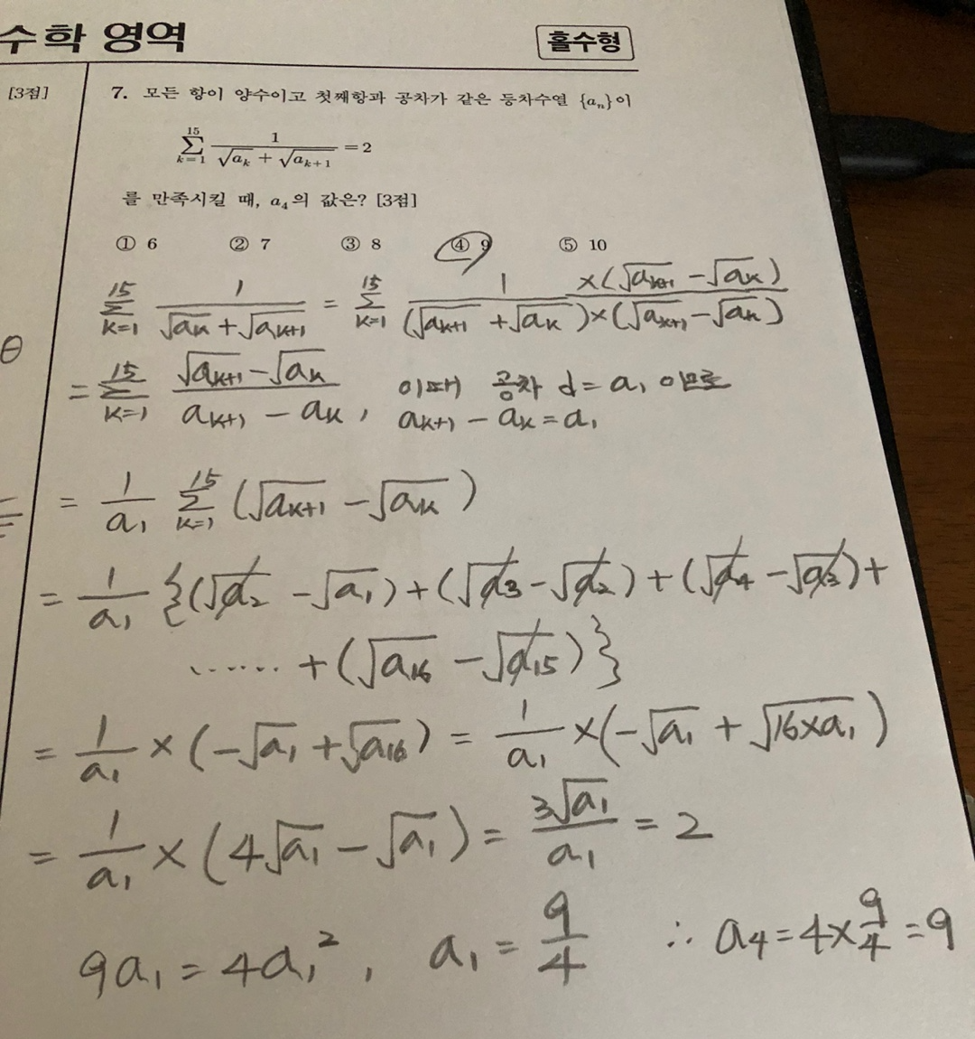 7번 문제는 등차수열 문제입니다. 항상 풀면서 생각하지만 이렇게 푸는 것이 맞나 하고 의심이 들지만 풀고 나서 과정에 오류가 없으면 된다고 생각합니다. 관련 공식이 기억이 나지 않더라도 원리에 어긋나지 않고, 장황하고 길더라도 모두가 이해할 수 있으면 된다고 생각합니다.